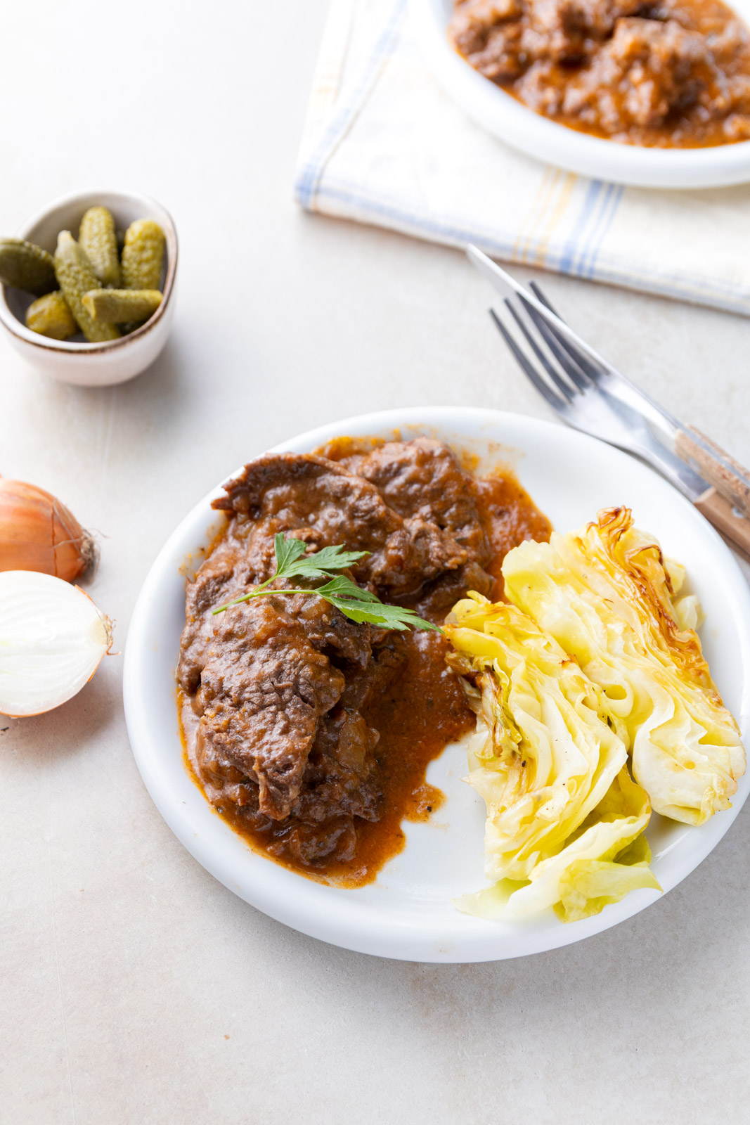 Po duszeniu robi się naprawdę kruche i delikatne. Najpierw obsmażam plastry wołowiny na dobrze rozgrzanym tłuszczu, żeby się zarumieniły (i żeby powstał smak do sosu). Potem na tej samej patelni podsmażam cebulę i czosnek, ja daję ich sporo, bo bardzo lubię je w sosie. Całość trafia do garnka i dusi się, aż mięso zrobi się miękkie, a sos aromatyczny.