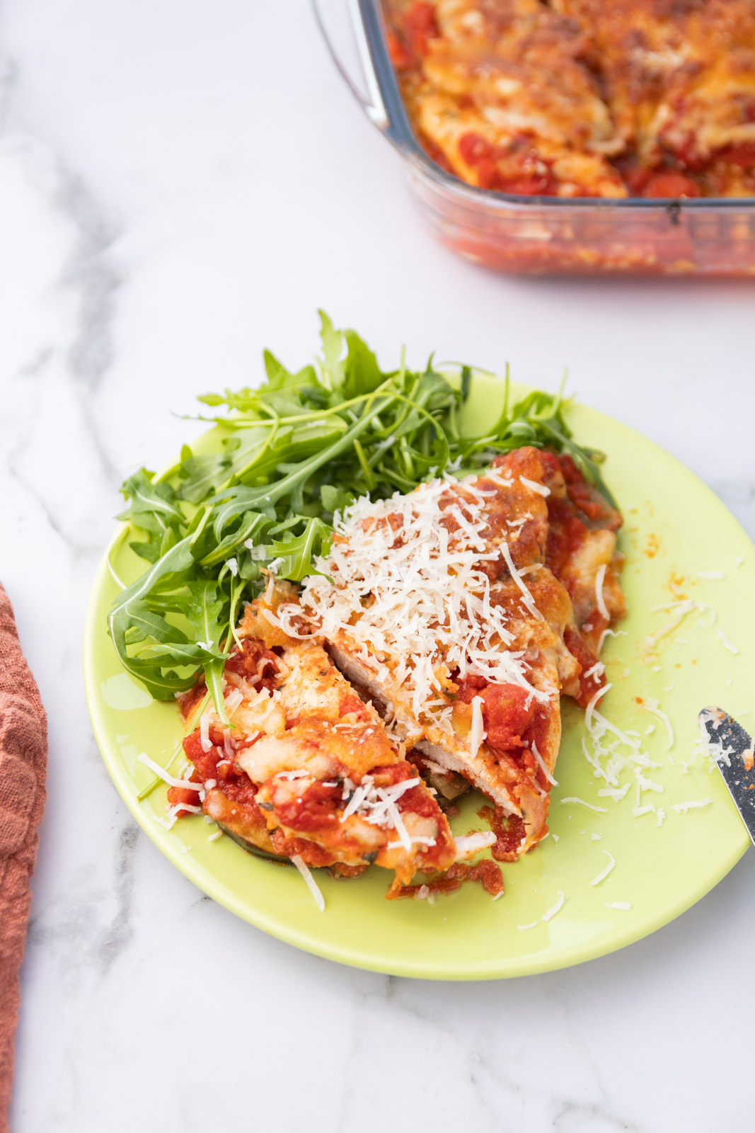 Inspiracją było klasyczne melanzane alla parmigiana i chicken parmigiana, ale dodałam kurczaka, żeby zwiększyć ilość białka i sprawić, że danie lepiej syci. Zrobiłam też wersję bez panierki, wiem, że dla niektórych to kontrowersyjne, ale serio, jest równie pysznie no i zdrowiej!