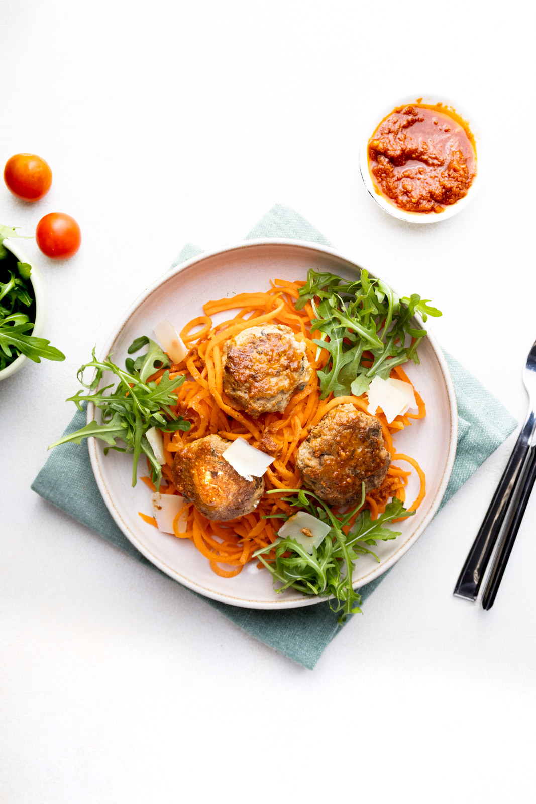 - Obraną marchewkę przeciśnij przez obieraczkę obrotową do warzyw, aby uzyskać długie paski przypominające spaghetti “marchewkowe spaghetti”. Następnie takie spaghetti możesz sparzyć wrzątkiem, krótko zblanszować lub lekko podsmażyć, w zależności od tego, jaką teksturę lubisz. Wymieszaj z pesto i wyłóż na talerz, dodaj klopsy, posyp startym parmezanem i podawaj z ulubioną sałatą, u mnie najlepiej sprawdza się rukola. Smacznego 🙂